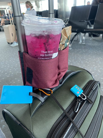 1. A luggage-mounted cup caddy that'll free up your hands so you can hold your phone, boarding pass, passport — you know, the ~essentials~ (not that your XL iced mocha isn't an essential, but, you know...)