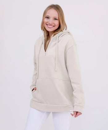 Promising review: "I fly a lot and am constantly trying to find a hoodie with a big hood to cover my eyes so I can catch up on some beauty sleep on flights. I saw this product on Instagram and knew it would be a game changer. I was able to use it recently for the first time on an early morning flight, and let me tell you, it is EVERYTHING I was looking for and more. It’s comfy, cozy, oversized, and the eye covers make you feel like you’re in a whole other world and not packed like a sardine on a plane. My over-ear headphone fit perfectly under it, and I got the best sleep I’ve had on a plane — EVER! Like other reviews have said, it is big, so size down if you want something a little more snug. I have been wearing it every day at home and can’t wait to get the black and blush ones!" —Heather G.